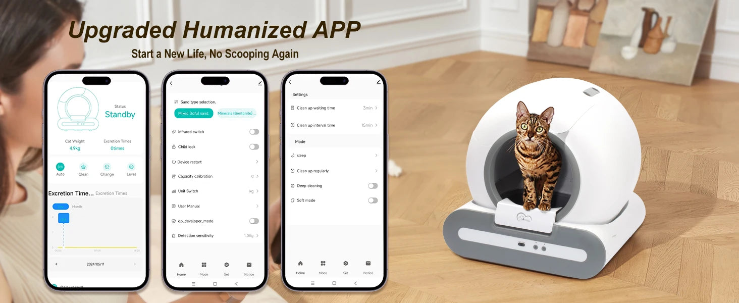 🐱 App Control & Health Monitoring - You can control the self-cleaning cat litter box via the app anytime, anywhere, and continuously monitor your cat's health and activity status. *Only supports 2.4G Wi-Fi. APP networking is more convenient, and the APP interface has added sand type selection, soft toilet cleaning mode, deep cleaning mode, etc.