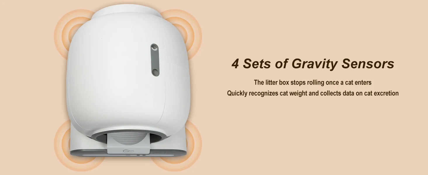 🚪 Cats Safety - The bottom of the device is equipped with four gravity-sensing sensors. Information regarding your cat's toileting, including frequency, timing, and weight changes, will be displayed through the application. For accurate monitoring, please place the device on a hard, flat surface, and avoid placing it on top of litter mats/carpets. Additionally, front-facing infrared sensor can automatically stop rotation when your cat approaches, ensuring your cat's safety. (Note: The infrared sensor function is off in the initial state, for the first time to use, please open the function